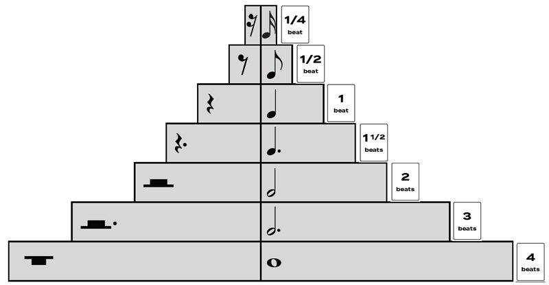 - Starting from the bottom, there are whole notes/rests (4 counts), dotted half notes/rests (3 counts), half notes/rests (2 counts), dotted quarter notes/rests (1 1/2 counts), quarter notes/rests (1 count), eighth notes/rests (1/2 count) – 1 flag/beam, and sixteenth notes/rests (1/4 count) – 2 flags/beams!